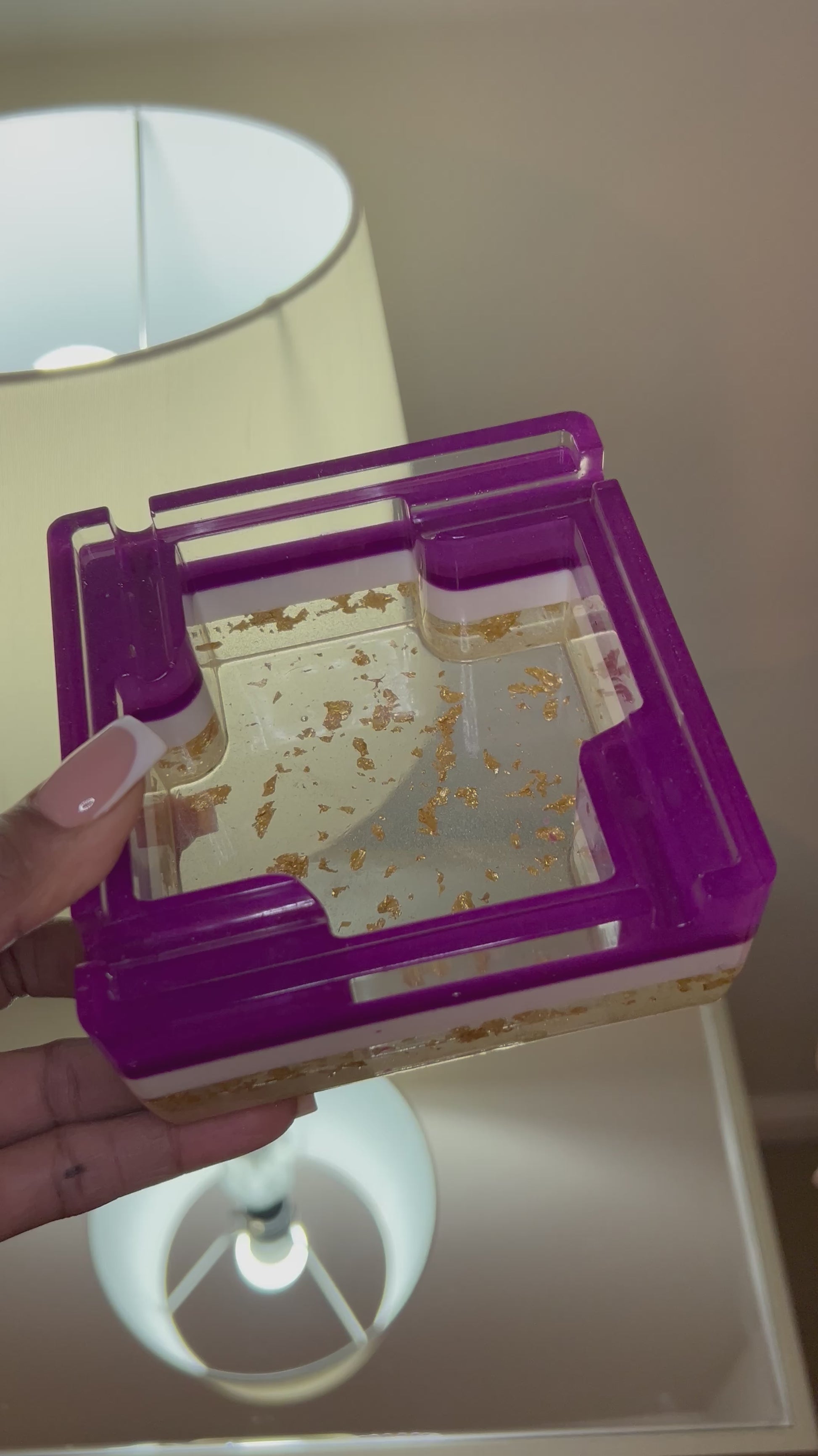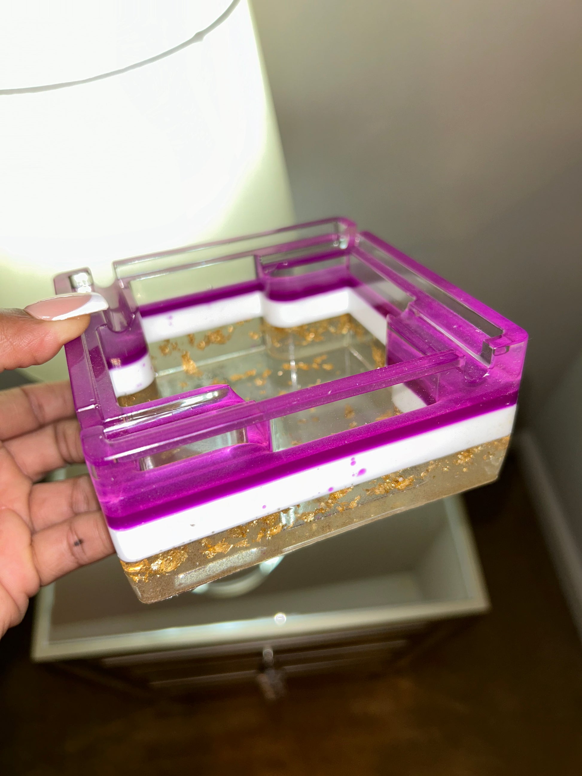 Dive into sophistication with our deep resin ashtray, a captivating blend of luxury and style. Layers of pristine white, regal purple, and opulent gold flakes intertwine within the clear resin, creating a mesmerizing visual depth. This tastefully crafted piece is not just an ashtray; it's a work of art that adds a touch of glamour to your space. Elevate your smoking experience with this uniquely designed resin ashtray, where elegance meets functionality in every layer.